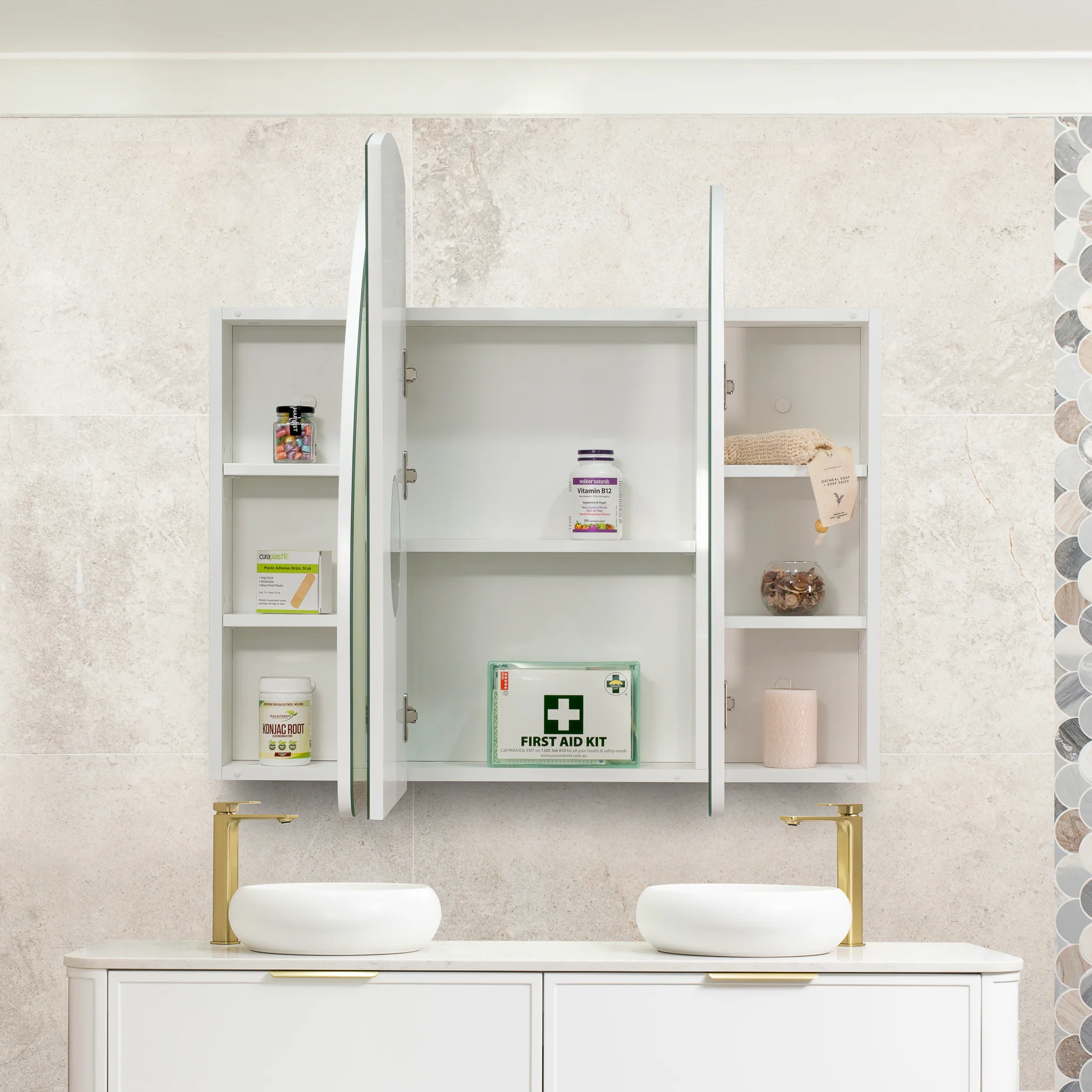 A stylish arched shaving cabinet mirror with soft-close hinges, hidden storage, and a slim frame to complement modern bathrooms.