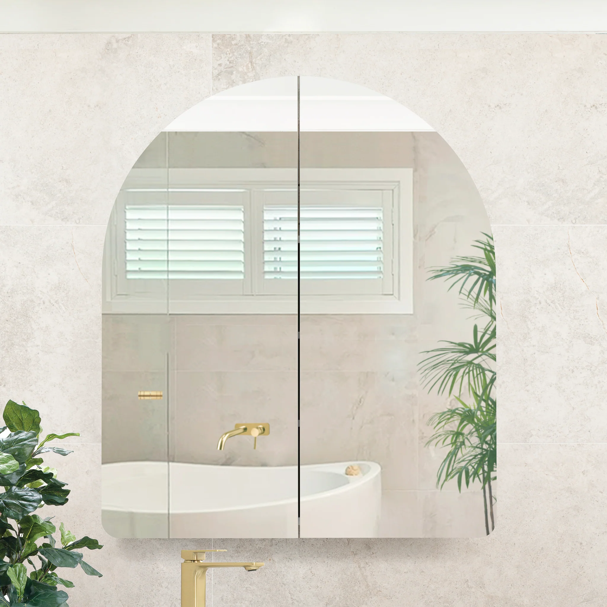 A stylish arched shaving cabinet mirror with soft-close hinges, hidden storage, and a slim frame to complement modern bathrooms.