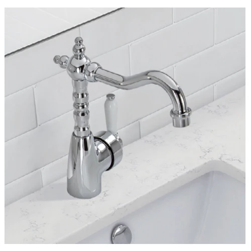 Fienza Eleanor Shepherds Crook Basin Mixer I Chrome I Ceramic White Flick Mixer Handle